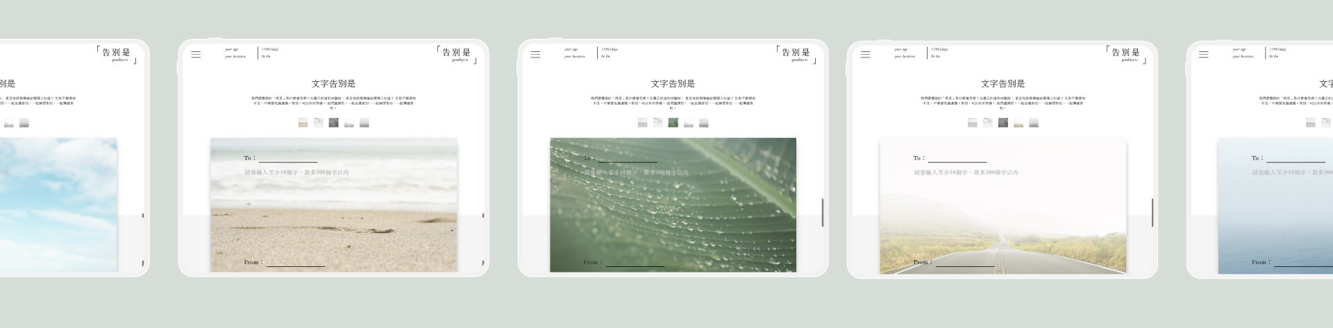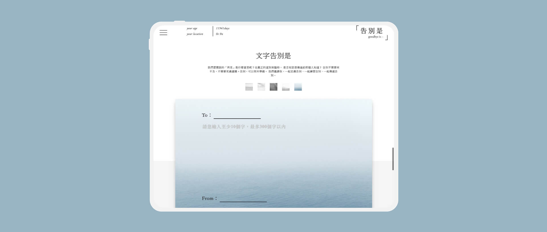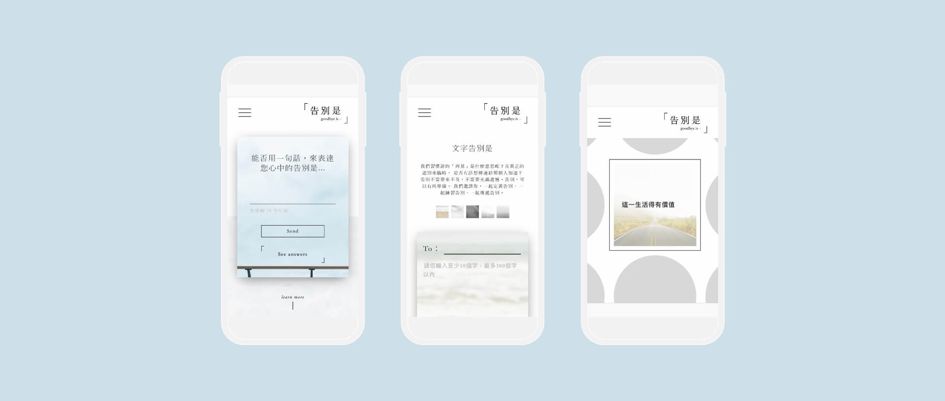 “goodbye-is.com” is a platform where you can practice how to say goodbye to your beloved ones by writing or voice recording. It is never too late — and never too early — to address your concerns and decision about your life and death. Say goodbye properly, instead of leave regretfully. We hope that by “ goodbye-is.com” people would begin to define, practice and deliver their messages of farewell.