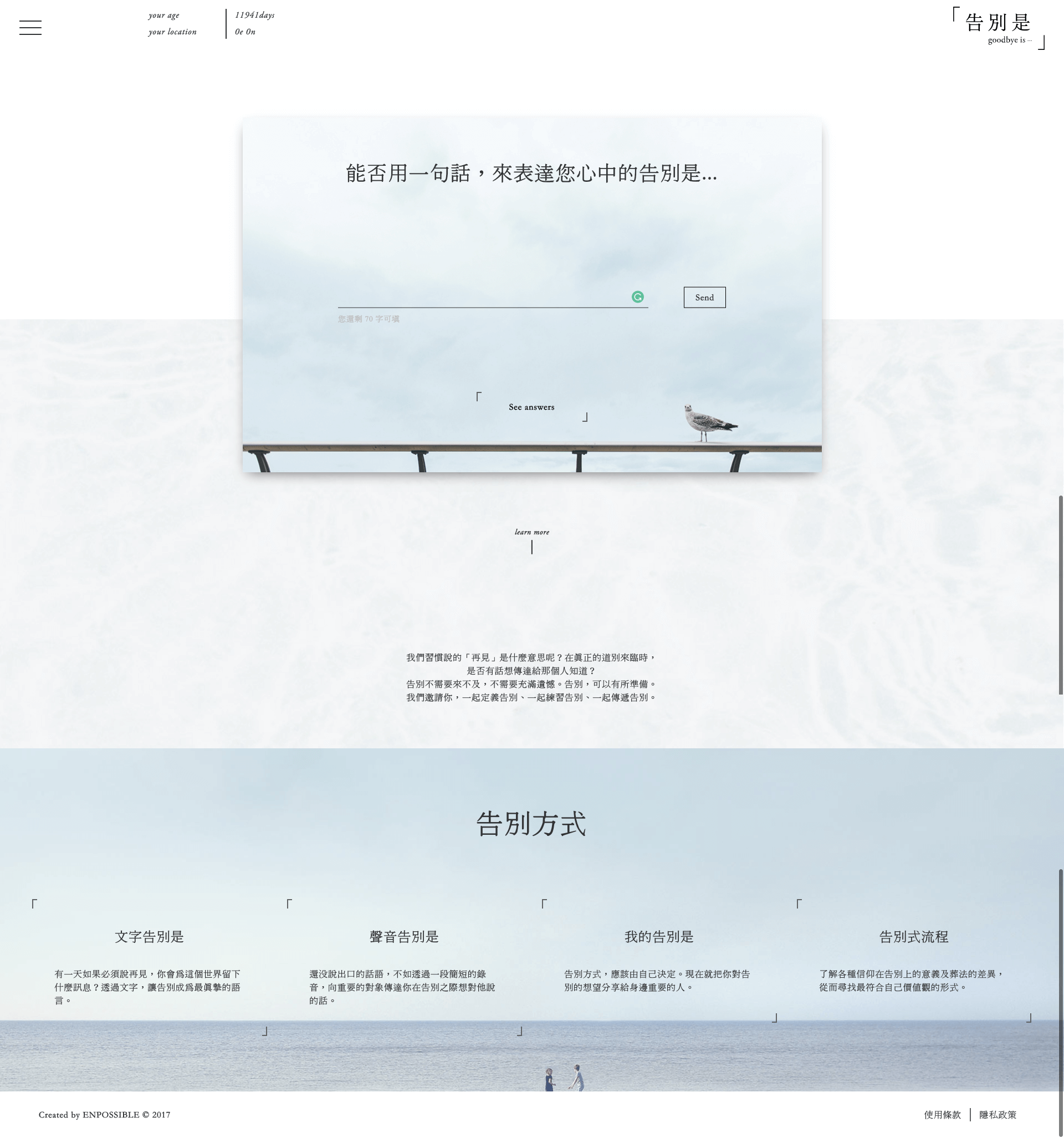 “goodbye-is.com” is a platform where you can practice how to say goodbye to your beloved ones by writing or voice recording. It is never too late — and never too early — to address your concerns and decision about your life and death. Say goodbye properly, instead of leave regretfully. We hope that by “ goodbye-is.com” people would begin to define, practice and deliver their messages of farewell.