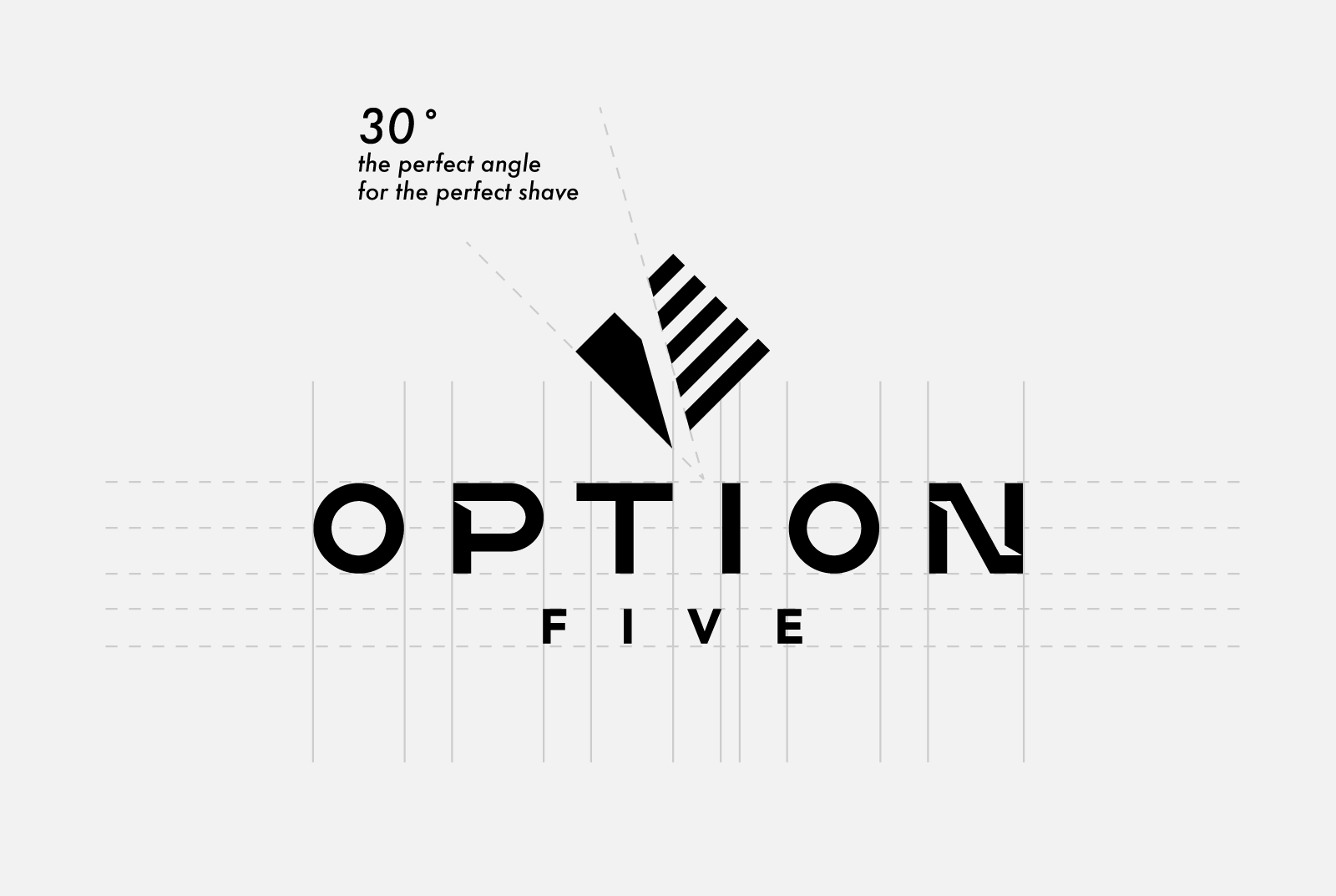The ethos of the safety razor is that there is a perfect angle for holding the blade to your skin, this perfect angle is 30 degrees. The angle became the back mode for the conception of the Option 5 logo, a blade cutting through hairs.